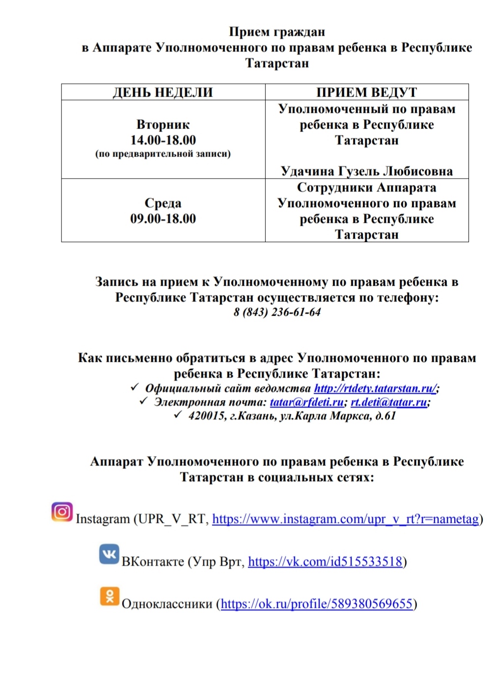 Прием граждан в Аппарате Уполномоченного по правам ребенка в Республике Татарстан