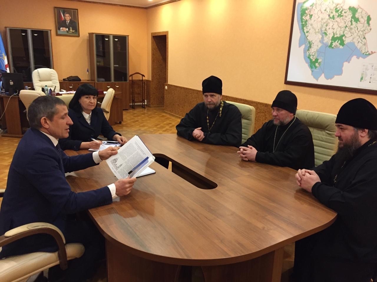 Руководитель Лаишевского района Ильдус Зарипов встретился с православными священнослужителями - благочинным района отцом Фёдором, настоятелем Софийского собора отцом Никодимом и настоятелем церкви Николая Чудотворца отцом Сергием.