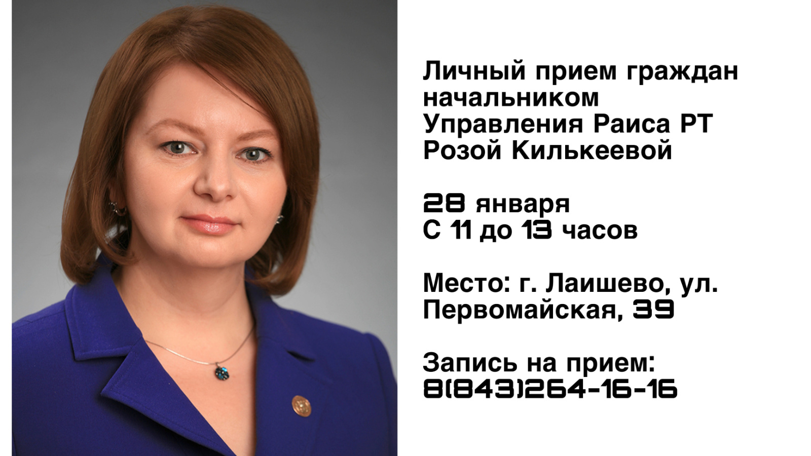 В Лаишевском районе состоится личный приём граждан начальником Управления Раиса Республики Татарстан по работе с обращениями граждан Розой Рифкатовной Килькеевой. Мероприятие запланировано на 28 января 2026 года с 11:00 до 13:00.