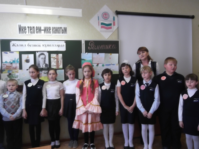 В МБОУ Среднедевятовской СОШ в рамках Недели родного языка учитель татарского языка Зайнутдинова Р. Н. для учащихся начальных классов провела КВН "Джалиль в наших сердцах". Мероприятие было посвящено 70-летию со Дня Победы в ВОВ.