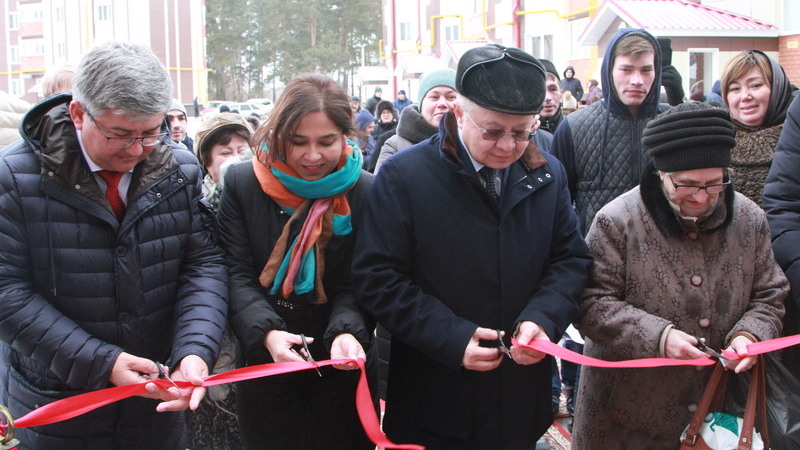 Михаил Афанасьев, Ирек Фәйзуллин һәм Гүзәл Удачина торак алучыларны өй туе белән котладылар, аннан соң аларга ачкычлар тапшырылды. Соңрак мактаулы кунаклар кызыл тасманы кистеләр һәм квартирларны карадылар.