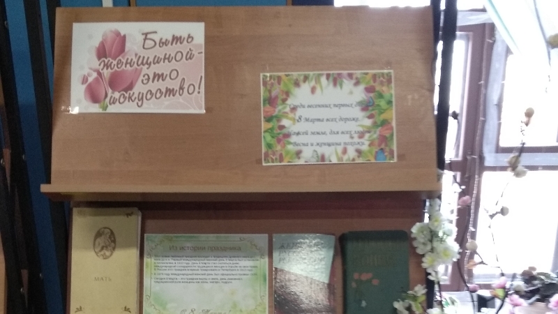 Бу датага Үзәк китапханәдә «Быть женщиной – это искусство!» тематик китап күргәзмәсе оештырылган. Укучылар игътибарына исемнәре илебез тарихына язылган төрле эпохаларның бөек хатын-кызлары язмышы, ничек ягымлы һәм элегант булып күренү, озак елларга сәламәтлекне, матурлыкны һәм эшкә сәләтлелекне ничек сакларга, ничекяхшы кәефле, мөлаем һәм сихри булып калырга икәнлеге турында сөйләүче китаплар һәм журналлар тәкъдим ителә.