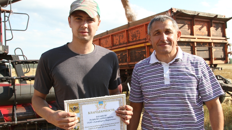 Лаеш районы җитәкчесе Илдус Зарипов басуларда аграрийлар белән аралашты, яхшы эшләре өчен рәхмәт белдерде, комбайнчыларга, машина йөртүчеләргә һәм механизаторларга Рәхмәт хатлары тапшырды.